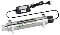 Appareil électronique qui élimine bactéries et micro-organismes dans l’eau en utilisant une lampe avec les faisceaux ultra-violets. En d’autres termes le stérilisateur de l’eau intensifie, multiplie et remplace l’action des faisceaux solaires qui en nature est la meilleure méthode de stérilisation.