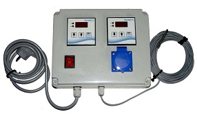 Affichage digital et programmation de temps de brumisation ARRET/PAUSE. Programmation digitale de 1 seconde à 99 minutes - Relais statique SSR 20a 2Kw pour pompe jusqu’à 13 litres - 2m de câble avec prise et une prise de branchement pour le câble de la pompe - 220V 50Hz.
